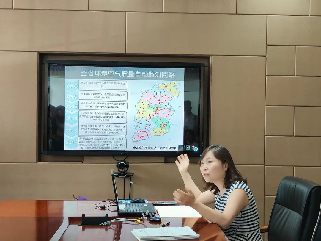 接下来,在一楼环境空气质量预报预警中心,毕业于我校环境与资源学院的工程师朱丽娅老师为实践队队员讲解了全省环境空气质量自动监测站的建设历程、环境空气质量自动监测数据的用处以及环境空气质量指数的标准。