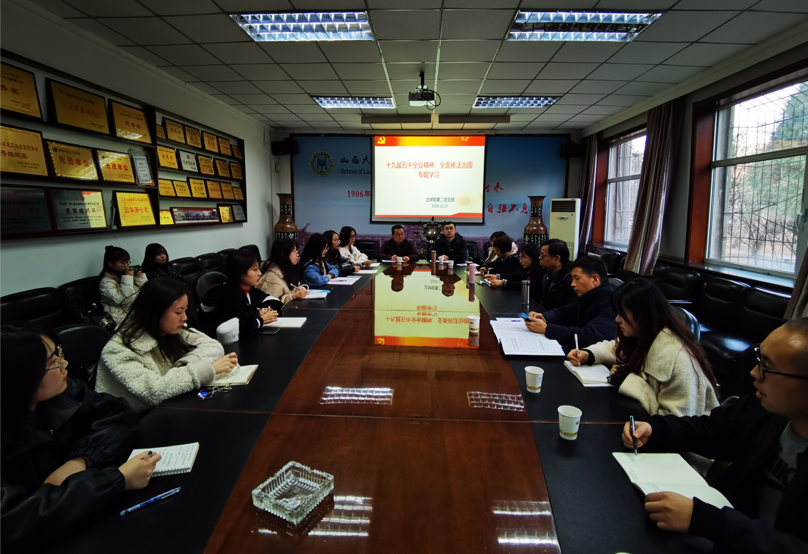 2020年11月27日下午15:00-18:00,在买球的app软件下载会议室,经济法教研室举行本学期第五次教研活动。会议由教研室副主任李冰老师主持,教研室董玉明、李冰强、温树英、黄晓燕、王士亨、赵大为、王中庆、武继华、秦倩老师以及经济法专业的11名硕士研究生参加了此次会议。本次会议的主题是“学术年会参会及科研成果交流”。